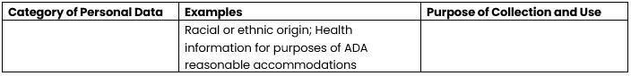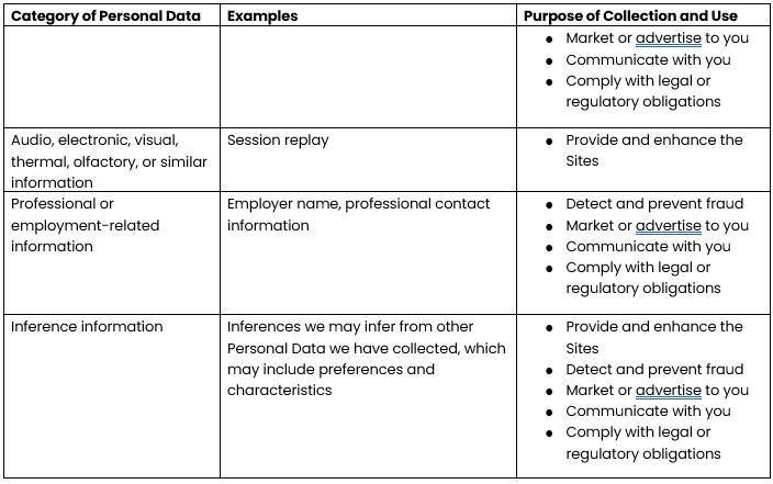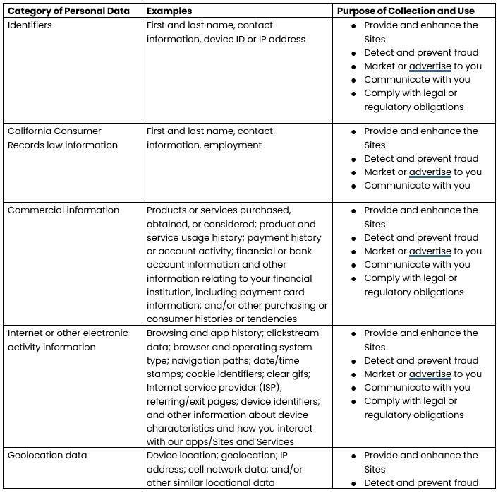 We may collect the following categories of Personal Data, for the purposes stated in the chart.