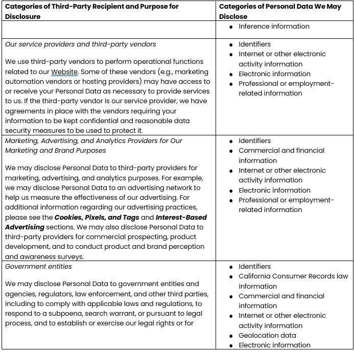 Categories of third parties to whom the Personal Data was sold, shared, or disclosed for a business purpose; and