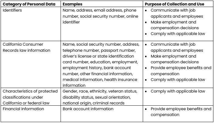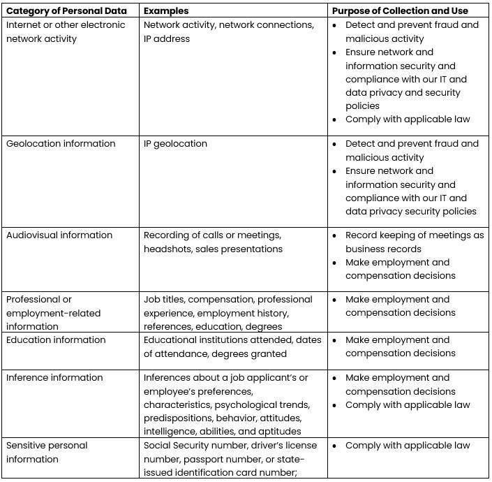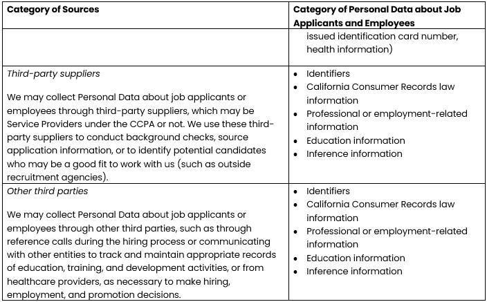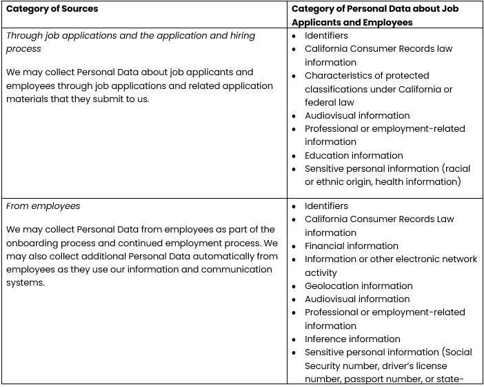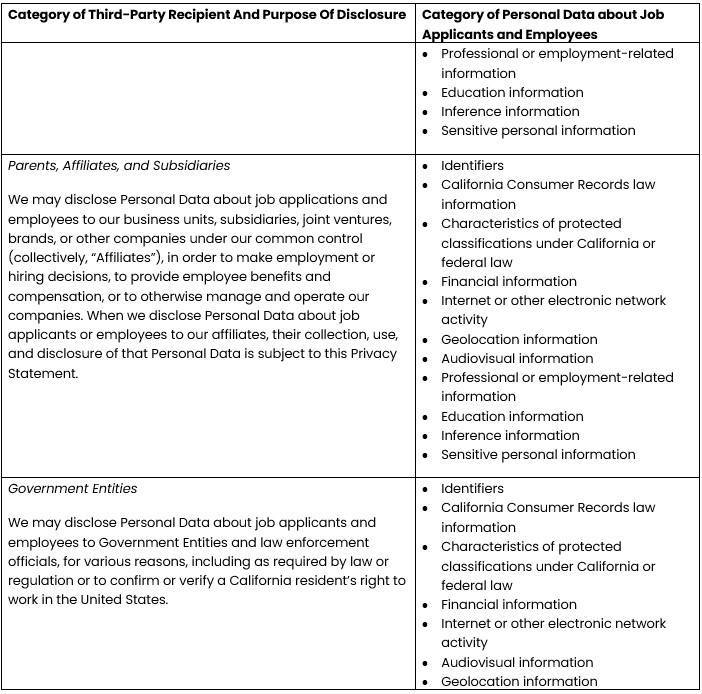 This subsection contains information about how we may collect, use, and disclose the Personal Data about California residents related to any job application or employment with us. This subsection does not contain information about how we may collect, use, and disclose Personal Data about California residents not related to any job application or employment with us, which is described in the remainder of this Privacy Statement. This subsection does not apply to non-California residents.