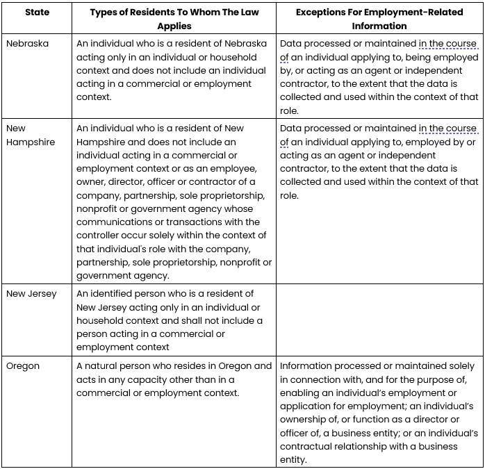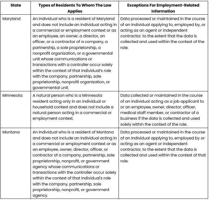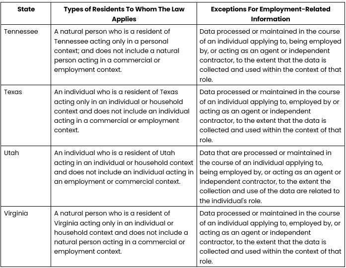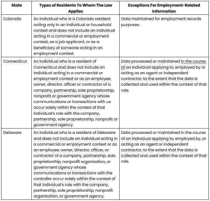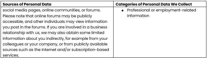 For example, Certain States’ laws do not apply to publicly available Personal Data or to Personal Data of an employee. And Certain States’ laws apply only to state residents when acting in an individual or household context, but not when they are acting in a commercial or employment context. For these states, that means if you are using our products and services in connection with employment, these disclosures are unlikely to apply to you or your Personal Data.