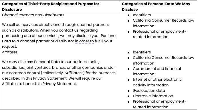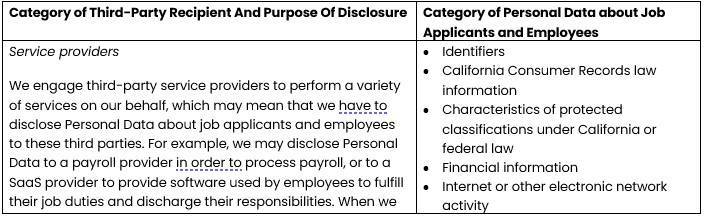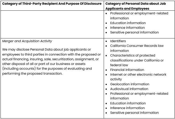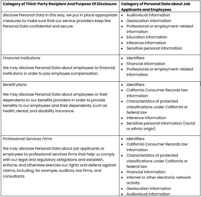 We disclose Personal Data of job applicants and employees as follows, and we may have done so in the past 12 months: