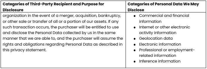 For example, if you are a California resident and apply for a job with us through the Careers page on our Website, the Privacy Statement outside of this subsection explains how we may collect, use, or disclose the Personal Data we collect or generate about you as you browse or navigate our website. This subsection explains how we may collect, use, or disclose the Personal Data you submit by clicking “Apply Now For This Position” on our Website to apply for a job.