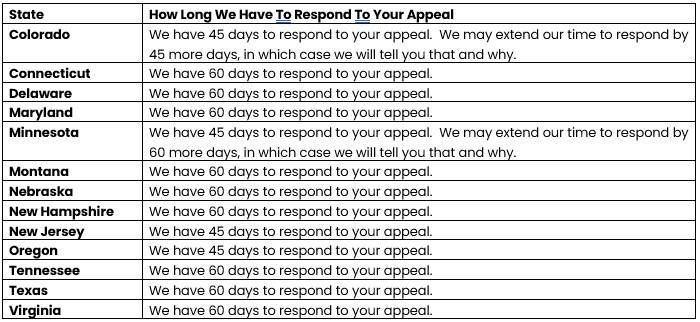 You may appeal our decision by emailing us using the information in the Contact Us section with the subject line “Appeal of Request” and including our response to your request. We will also include this information in our response to your request. If you appeal our decision, we will have 60 days to respond to your appeal.